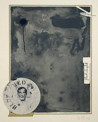 In the lithograph, although the integrity of the individual canvases is obscured, the other translations of assemblage remain. In both painted and graphic forms, red, yellow, and blue are spelled out around the plate. This linguistic device, used by Johns more than once as a substitute for actual color, challenges the viewer to intellectualize, rather than visualize, the three primary colors that comprise painting's fundamental palette. Both Souvenir the painting and Souvenir the lithograph fuse memory and artistic vision and have been exhaustively interp